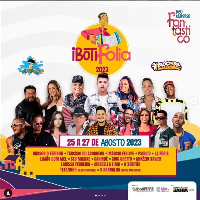 Na última semana foram anunciadas as atrações que farão parte da IbotiFolia 2023. O evento tradicional de Ibotirama no Oeste Baiano será realizado entre os dias 25 e 27 de Agosto. Durante os três dias diversas atrações nacionais, locais e regionais se apresentarão no evento que é realizado na cidade que fica às margens do Rio São Francisco. Confira as atrações abaixo:
