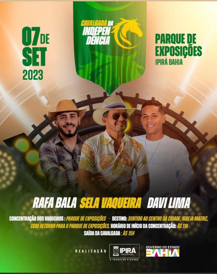 A tradicional Cavalgada do independência, que acontece sempre no dia 07 de setembro, em Ipirá, esse ano contará com shows das bandas Sela Vaqueira, Davi Lima e Raffa Bala.