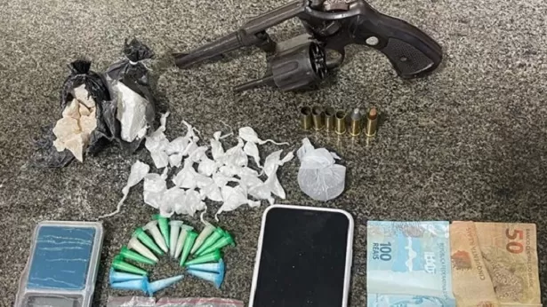 Ainda segundo a PM, com Kaique foram encontrados drogas, uma arma de fogo municiada, balança de precisão, dinheiro e um celular.