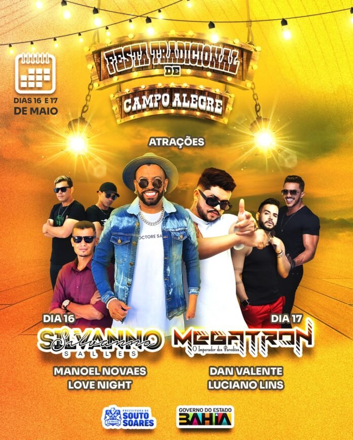 Os Cantores Silvanno Salles, Dan Valente, Megatron, dentre outros artistas, estarão presentes na Festa Tradicional de Campo Alegre em Souto Soares.