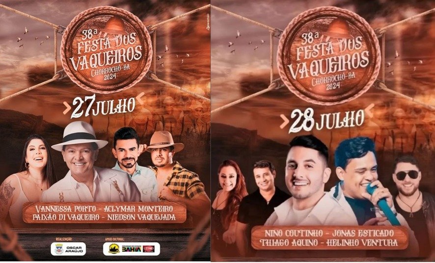 Entretenimento 38ª FESTA DOS VAQUEIROS – Chorrochó/BA 2024! By Portal do Recôncavo - 11 de julho de 2024 0 283 Compartilhar no Facebook Tweet on Twitter Programação: 27/07/2024 Vanessa Porto Alcymar Monteiro Paixão Di Vaqueiro Niedson Vaquejada 28/07/2024 Nino Coutinho Jonas Esticado Thiago Aquino Helinho Ventura