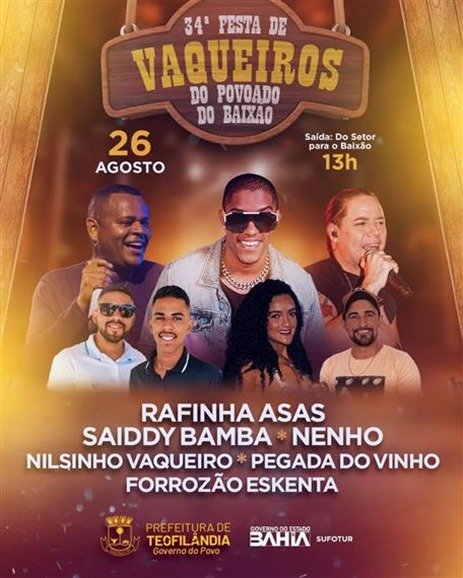 Uma das festas mais tradicionais do município de Teofilândia acontecerá no dia 26 de agosto. A 34ª Festa de Vaqueiros do povoado Baixão terá início à tarde, com a cavalgada saindo do povoado Setor até o local do evento, que terá os shows de Rafinha Asas (ex-cantor da banda Asas Livres), Saiddy Bamba, Nenho, Nilsinho Vaqueiro, Pegada do Vinho e Forrozão Eskenta.