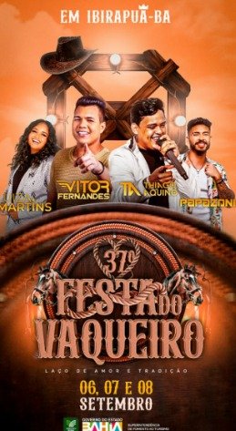 A 37ª edição da tradicional Festa do Vaqueiro de Ibirapuã teve início na sexta-feira, 6 de setembro, A abertura contou com shows eletrizantes de Luiza Martins, Luan Souza, Renato Souza, Kiko Cigano e Dieguinho, que encantaram o público, as comemorações continuaram no sábado (07/09/2024) com Amiga da Sofrência, Dangelys Show, Caninana, Thiago Aquino e Língua Doce, No domingo, 8 de setembro, a festa começou cedo, às 15 horas, com um trio elétrico comandado por Onyppe e Papazzone, garantindo muita diversão durante o dia. À noite, o palco principal recebeu os shows de Victor Fernandes, Emilly Ferraz e a Banda Stylo Prime, fechando o evento com chave de ouro.