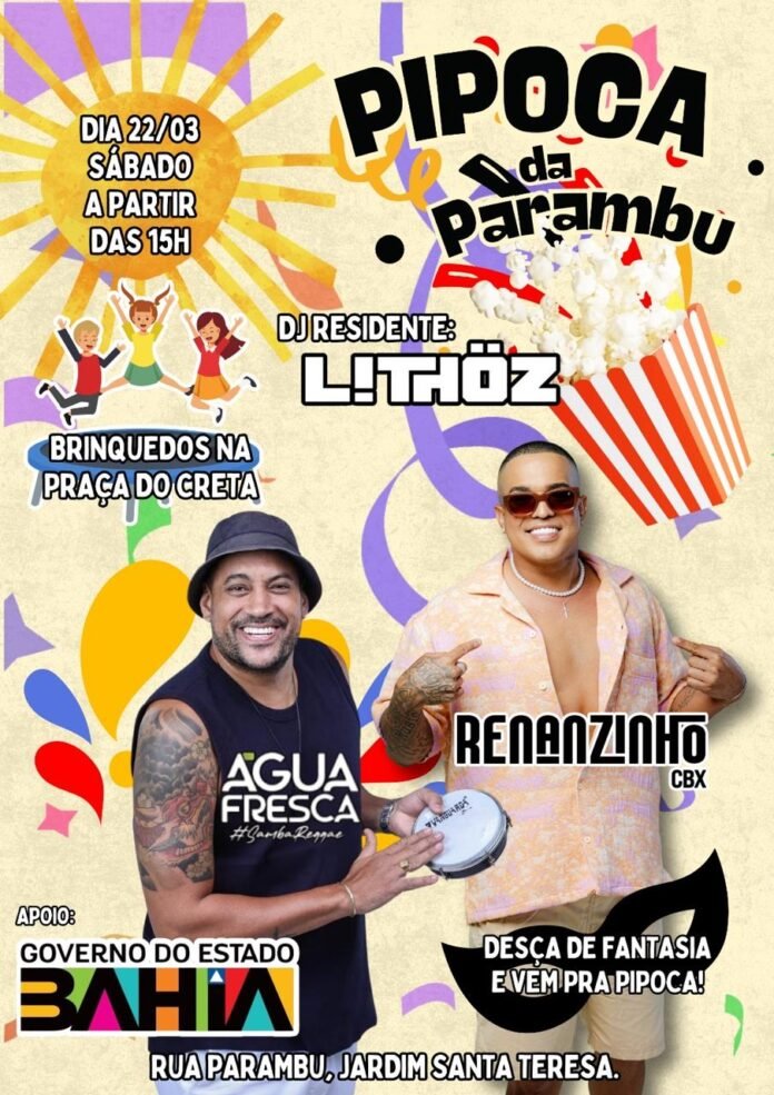 Nesse sábado, 22 de março de 2025, vai acontecer a Pipoca da Parambu, das 15 às 21 horas e promete agitar o Jardim Santa Teresa. O evento é gratuito e vai contar com um pranchão com apresentações de Água Fresca e Renanzinho CBX encerrando a folia. O público pode esperar um grande evento, uma estrutura boa, com praça de alimentação, banheiros e segurança.