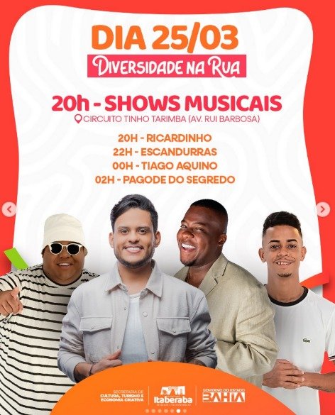 A Prefeitura Municipal de Itaberaba, divulgou através das redes sociais, a programação completa da festa que acontecerá no dia 25 de março de 2025, o evento contará com atrações de peso como: Thiago Aquino, Pagode do Segredo, Escandurras e Ricardinho. Promete ser a melhor festa de todos os tempos.