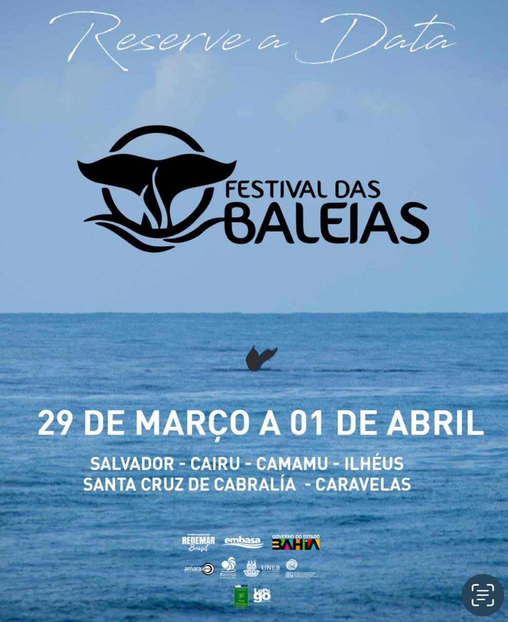 O festival das Baleias: Cultura oceânica, poluição dos oceanos e caminho das águas acontece de 29 de Março a 01 de Abril de 2025, passando por Salvador, Cairu, Camamu, Ilheus, Santa Cruz da Cabralia e Caravelas, o festival promete ser um marco importante na promoção da cultura oceânica e na conscientização sobre a poluição marinha om uma programação diversificada e ações inovadoras. O festival busca engajar a comunidade e destacar a importância da preservação dos oceanos.