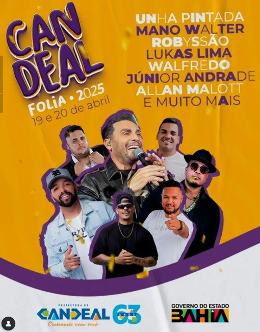CANDEAL FOLIA 2025 está chegando com tudo! Neste fim de semana, Candeal será palco de muita música, fé e celebração com o Candeal Folia, evento que marca uma tradição do município. A festa acontece neste Sábado de Aleluia (19/04) e Domingo de Páscoa (20/04), venha curtir shows incríveis com Unha Pintada, Mano Walter, Robyssão, Lukas Lima, Walfredo, Júnior Andrade, Allan Malott e muito mais! Prepare-se para dois dias de muita música e alegria em Candeal!