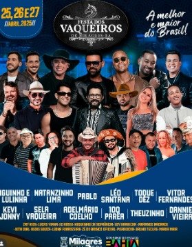 A Prefeitura de Milagres divulgou neste domingo (20) a ordem das atrações da tradicional Festa dos Vaqueiros 2025, que acontece entre os dias 25 e 27 de abril. O evento reunirá 24 atrações em três dias de festa e promete movimentar o município com shows de artistas consagrados.