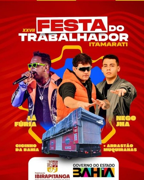A Prefeitura de Ibirapitanga juntamente com o Governo do Estado da Bahia, através da Sufotur, preparou uma grande festa para homenagear quem constrói com dignidade o dia a dia da nossa cidade, Com torneios, apresentações culturais, shows de Lá Fúria, Nego Jhá, Cicinho da Bahia e a tradicional puxada das Muquiranas, a alegria está garantida no dia 01 de maio de 2025!
