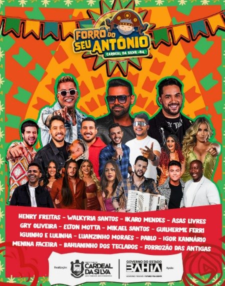 Tá tudo certo! A grade completa do Forró do Seu Antônio já está confirmada! Vamos abrir com chave de ouro os festejos juninos, reunindo grandes nomes da música em um evento que celebra nossa cultura e tradição, entre os dias 6 e 8 de junho. Com cinco bandas por dia, o evento terá mais de 20 horas de atrações musicais para agitar o período que antecede o São João no Litoral Norte da Bahia.