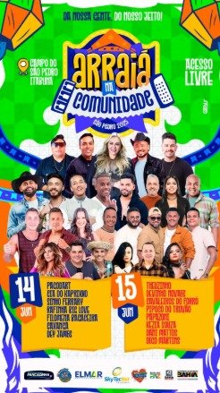 O Arraiá na Comunidade está de volta com tudo em Itabuna! Nos dias 14 e 15 de junho, o tradicional Campo do Bairro São Pedro será palco de uma das maiores festas juninas populares da Bahia. O evento, que já virou referência por valorizar comunidades carentes com grandes produções, promete superar expectativas nesta edição. Com superestrutura de palco, som, segurança e iluminação profissional, o arraiá vai reunir grandes nomes da música nacional e regional para dois dias de pura animação. Já estão confirmados: