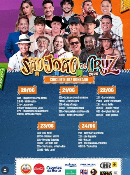 CONFIRA GRADE COMPLETA E HORÁRIO DOS SHOWS DO SÃO JOÃO DE CRUZ DAS ALMAS 2025