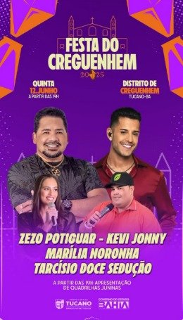 No dia 12 de junho de 2025, o clima de festa e tradição invade o distrito de Creguenhem com mais uma edição da tradicional Festa de Creguenhem, vai ter forró, emoção e aquela sofrência gostosa pra começar o São João do jeitinho que a gente ama! E as atrações já foram confirmadas confira: