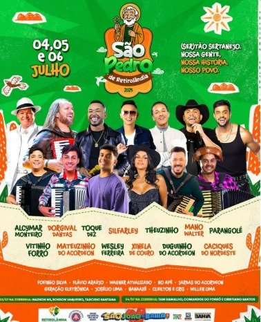 Prepare-se para viver momentos inesquecíveis com uma grade recheada de atrações que vão fazer você dançar até o dia clarear! De 04 a 06 de julho de 2025, esperamos por vocês no Melhor São Pedro do Brasil!