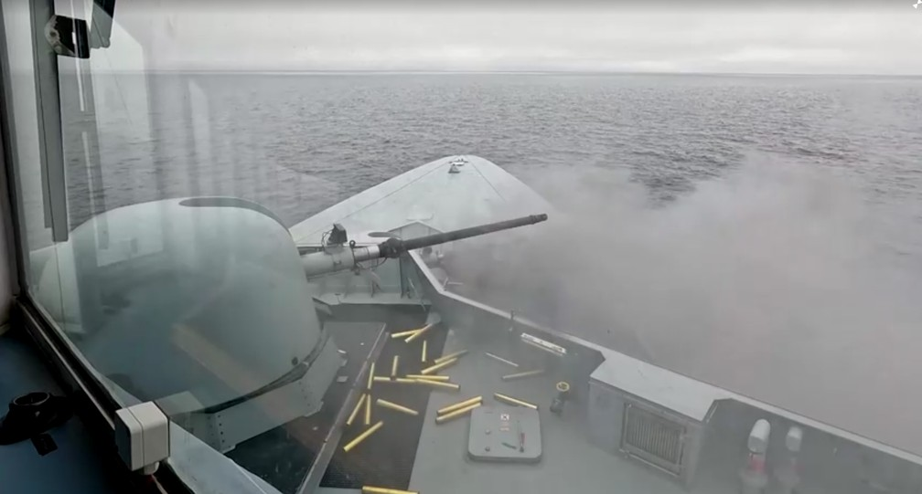 Fragata da Dinamarca efetua disparos em meio a exercícios militares na Groenlândia — Foto: Comando de Defesa da Dinamarca via REUTERS