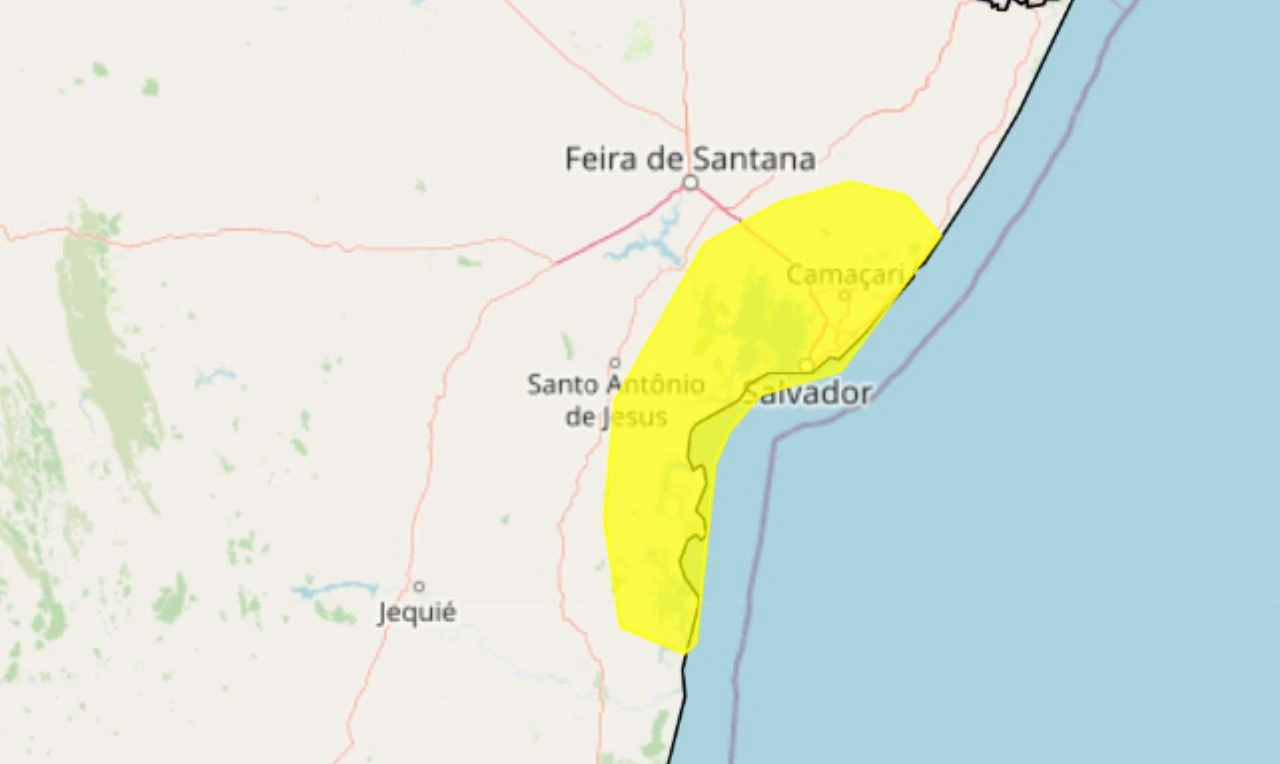 Partes da Bahia estão em alerta amarelo para acumulado de chuva, com volumes de até 50 mm/dia e risco de alagamentos