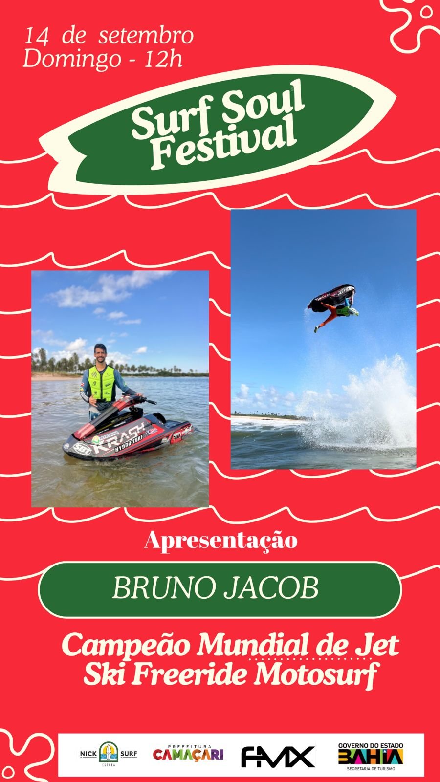 Com uma carreira internacional consolidada e títulos que o colocam entre os maiores nomes do motosurf mundial, Bruno Jacob retorna às águas baianas para uma apresentação especial que une técnica, ousadia e espetáculo visual. O pôster oficial do evento já antecipa a emoção: imagens do atleta em ação e ao lado de seu jet ski reforçam o clima de adrenalina que tomará conta da orla.